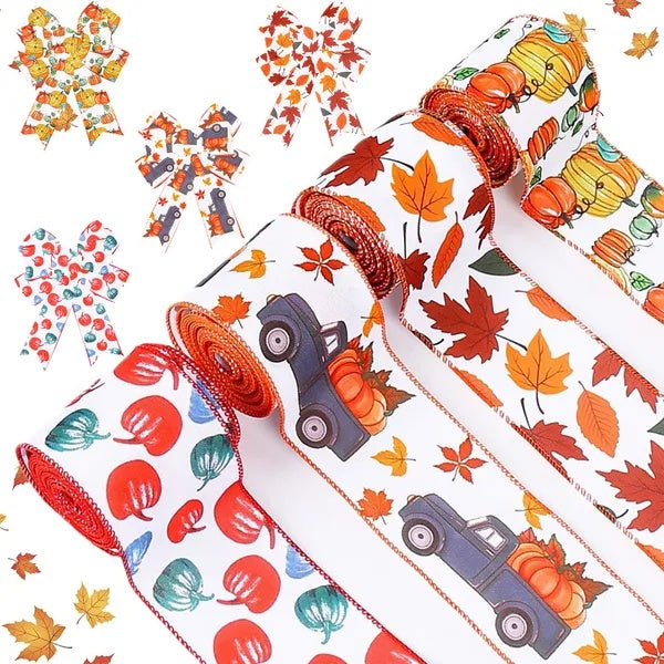 4Rolls 20Yards Thanksgiving Ribbons Autumn Wired Edge Ribbon Fall Themed Decorative Ribbon Pumpkin Maple Leaf Truck Grosgrain Ribbon For Thanksgiving Autumn Fall Party DIY Crafting Supplies